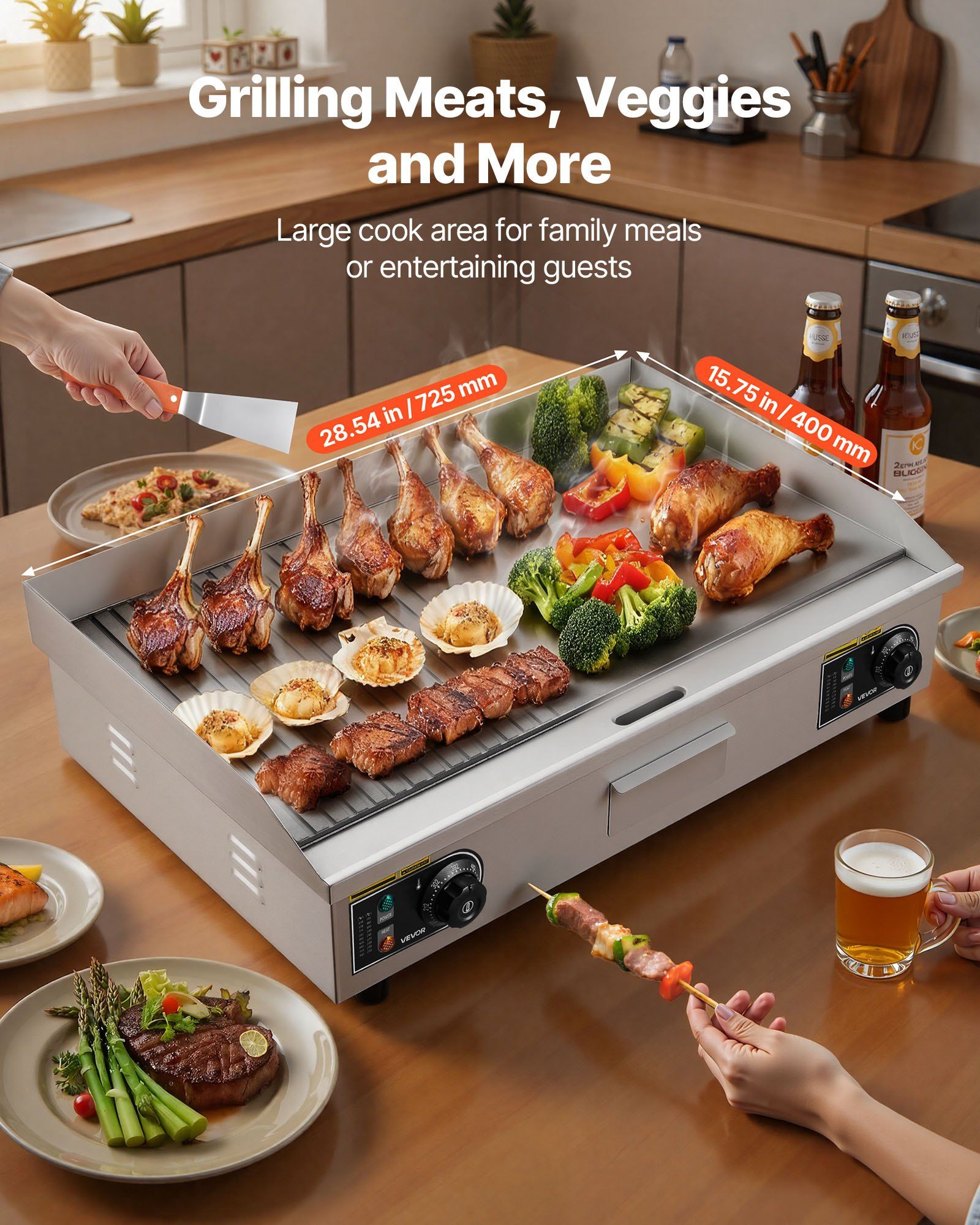 2.Precise Heating Control: Adjustable temperature from 122°F–570°F / 50°C–300°C, this stainless steel electric griddle lets you master the ideal heat for pancakes, steaks, chicken, and more
