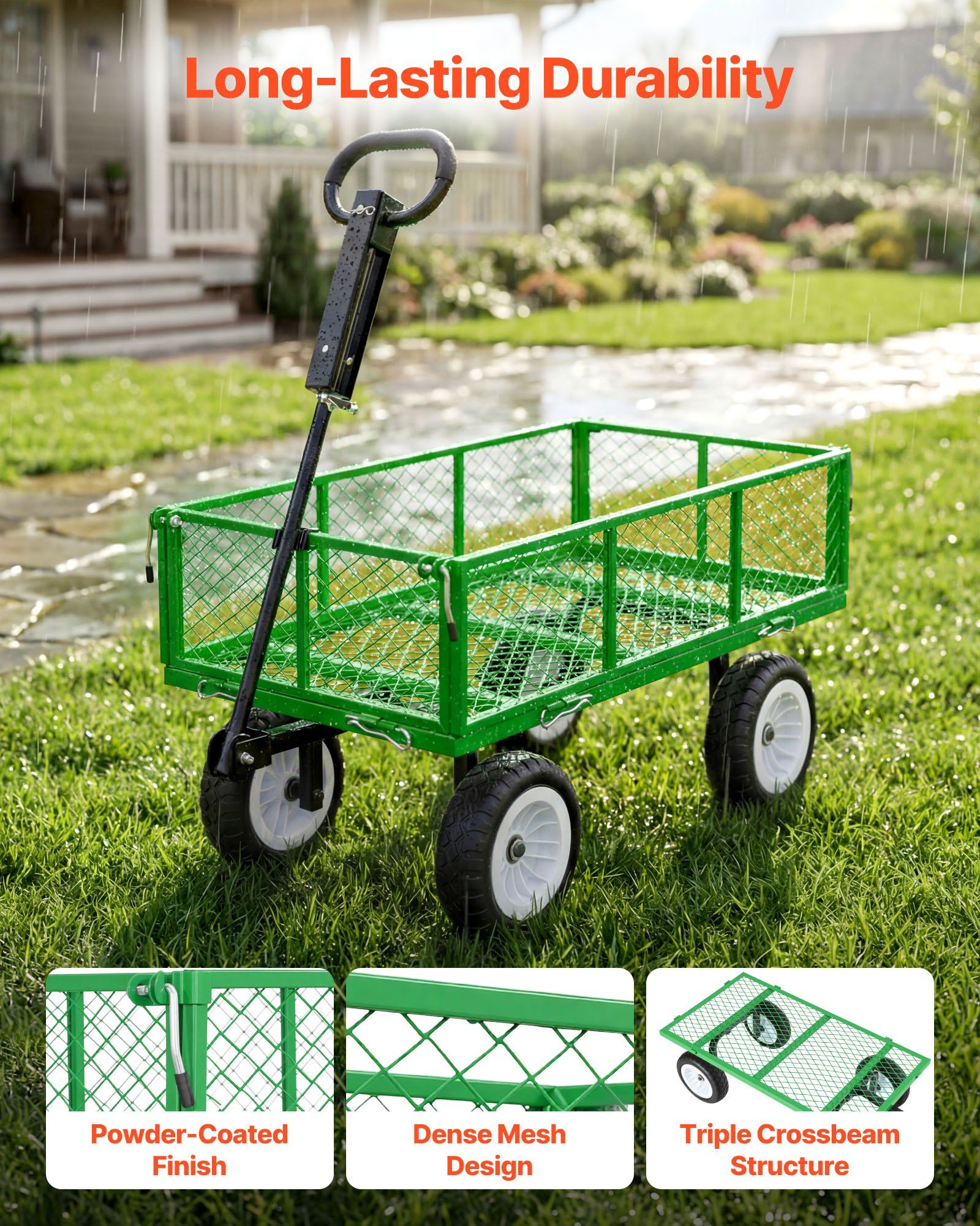2.Heavy-Duty Steel Construction: Built with a reinforced steel frame, multi-point support base, and weather-resistant powder coating, this garden cart resists rust, corrosion, and impact. The dense mesh avoids deformation for season-after-season outdoor use