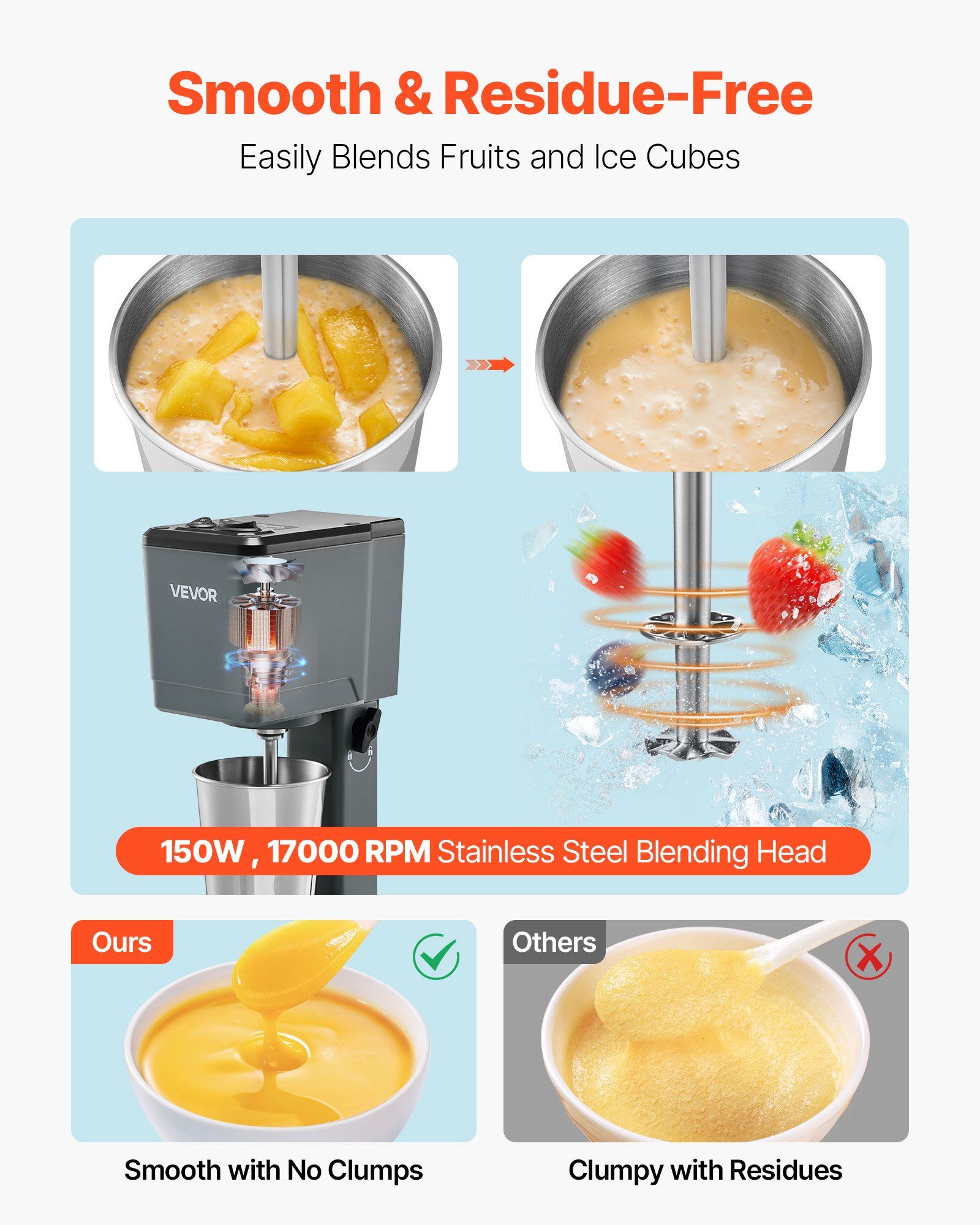1.Efficient and Powerful: Equipped with a 150W motor, the dual-speed design lets you switch freely between slow and fast. The milkshake maker stirs liquid drinks gently at low speed without splashing, while high speed is ideal for thicker blends