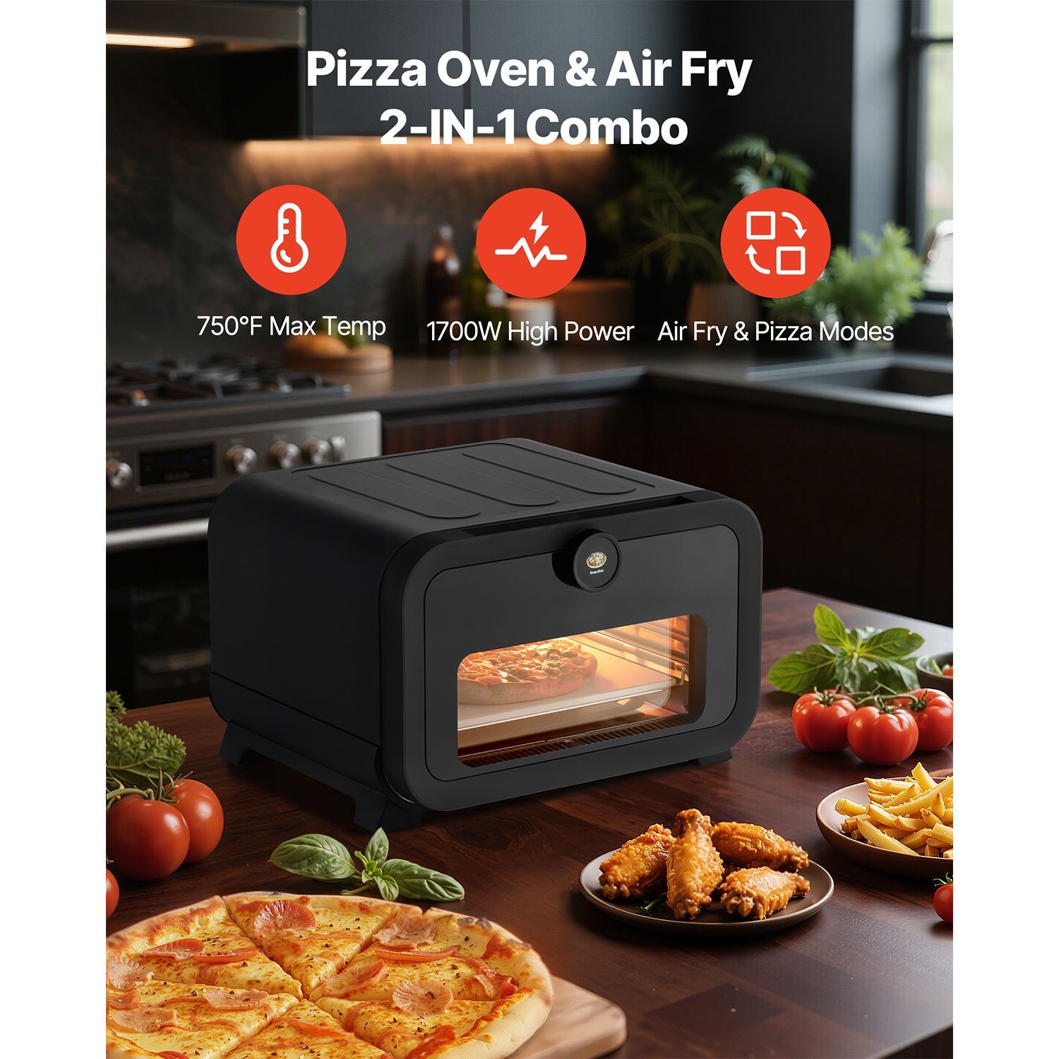 Pizza Oven, 8 Presets Electric Pizza Ovens Air Fry Combo, 12-Inch Indoor Pizza Maker Smart Knob Control , 750°F Max Temp, IPX4 Waterproof Countertop Pizza Cooker w/Pizza Stone,Fry Basket