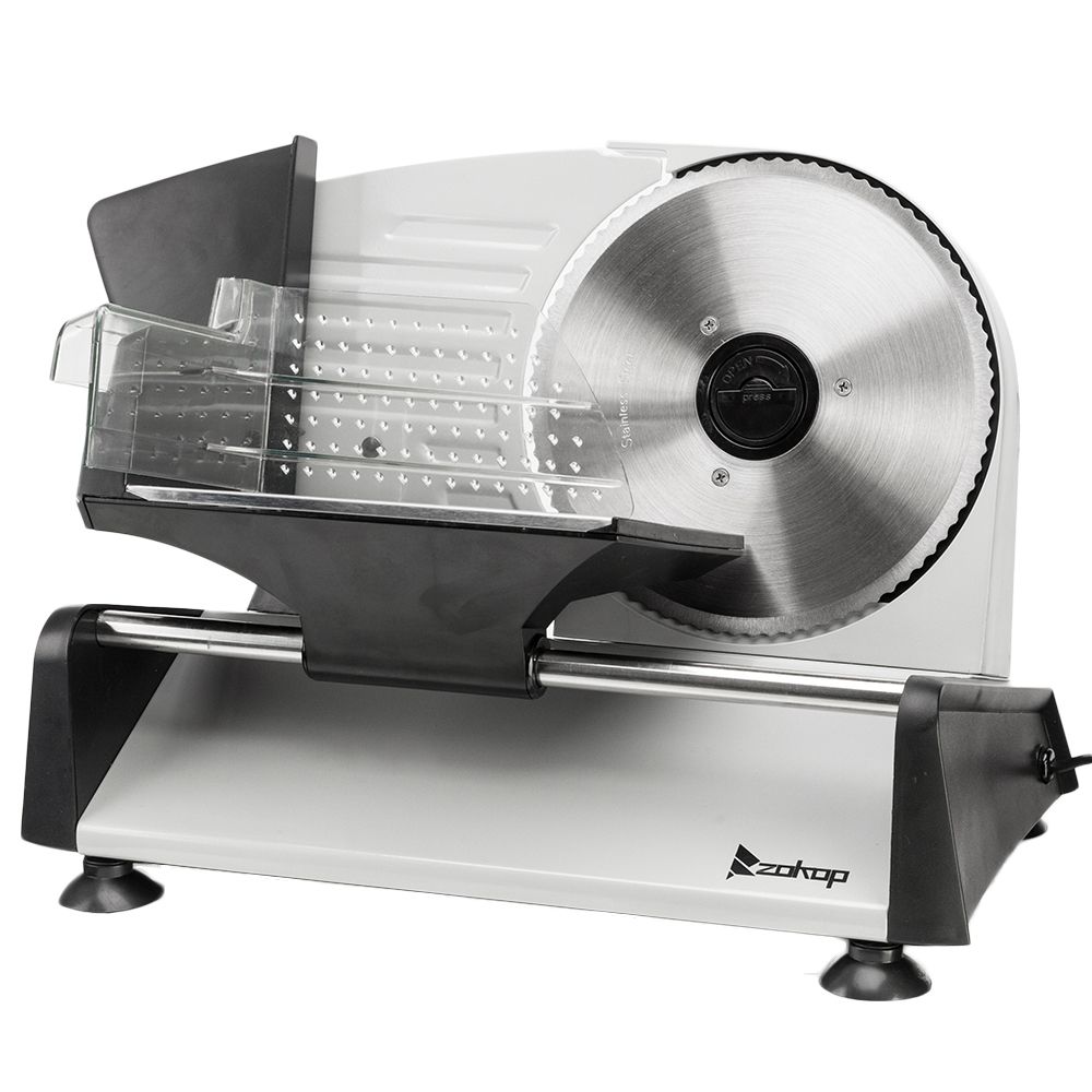 Make your kitchen more functional with the Food Slicer. It's a simple way to slice your own meats, cheeses, breads, vegetables and fruit quickly and easily at home. With sleek design food slicer pairs nicely with just about any kitchen decor. It has a specialized curve design that allows for easy slice removal. A thickness-control knob makes selecting your cut thickness simple. The large, multi-purpose 7.5" stainless steel blade handles a wide range of food sizes and types. Remove the blade for effortless clean-up and maintenance. A strong 150W motor offers plenty of power.