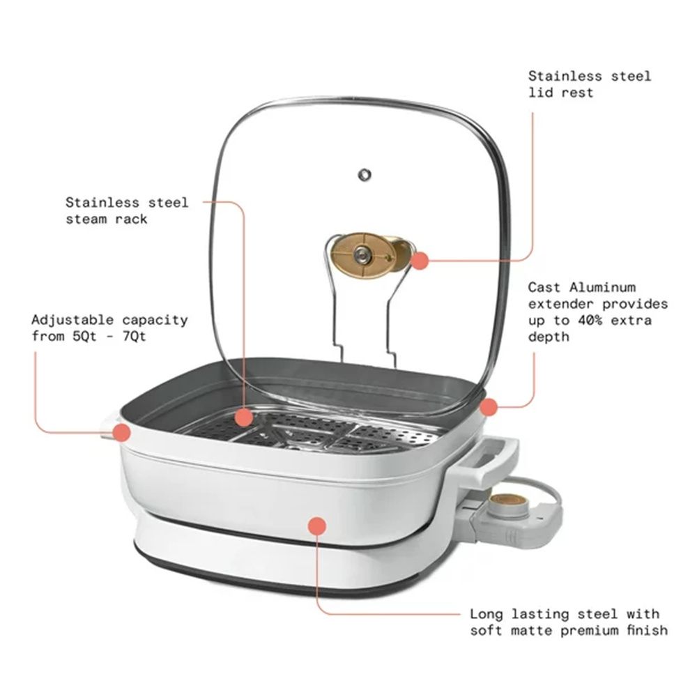1.The first electric skillet on the market with a cast aluminum extender that provides 40% extra depth, taking you from a 5QT capacity to 7QT capacity, the 5-in-1 Expandable Skillet sautes, steams, simmers, slow cooks and more.