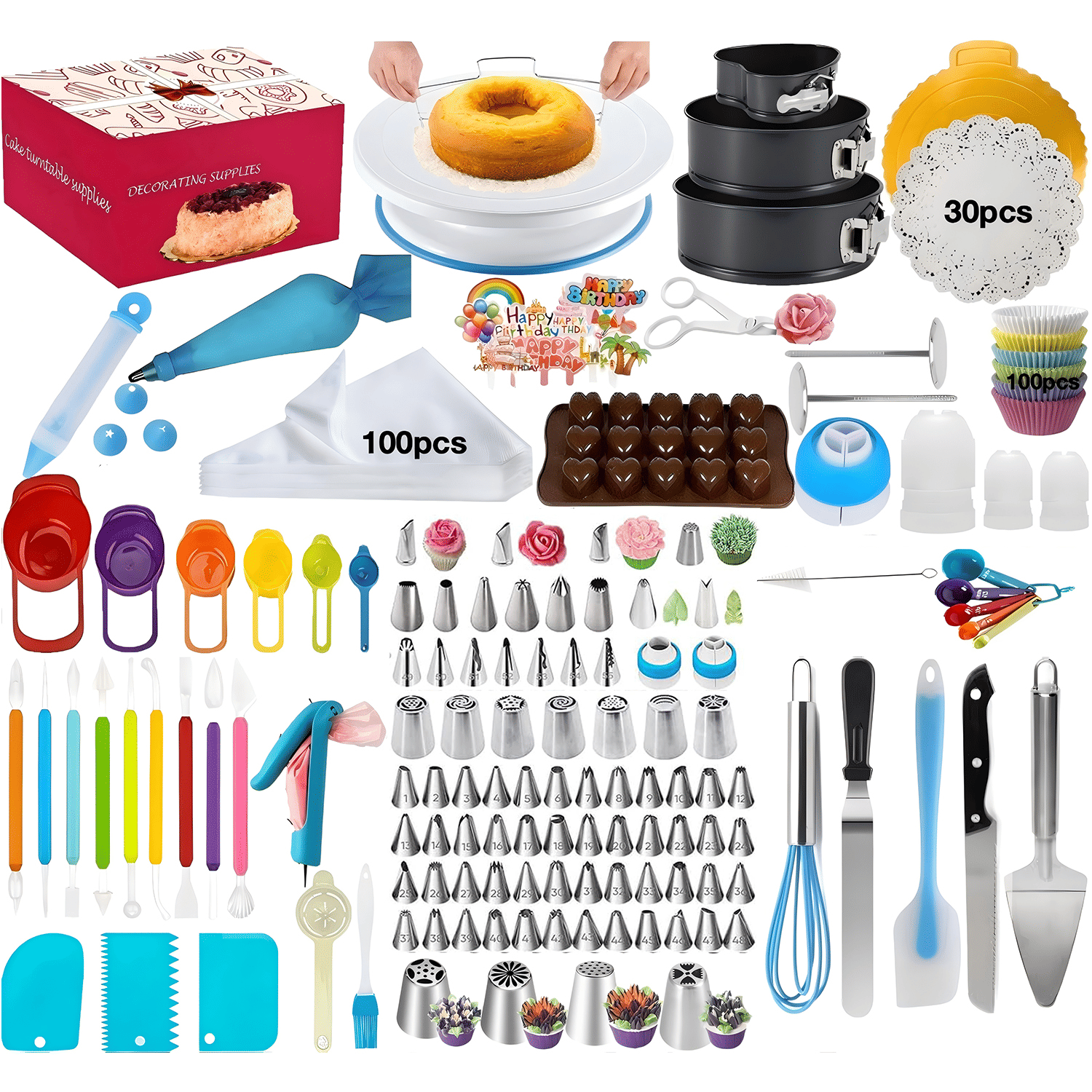 Whether you're a beginner or an experienced baker, this versatile cake decorating and baking kit has everything you need. The set includes 58 cake decorating tips, 3 non-stick springform pans, a rotating cake turntable, a cake carrier with lid, a cupcake holder, fondant sculpting tools, cookie stamp sets, a cake decorating spatula, a cake server set, chocolate molds, an icing scraper, a cake decorating pen, and 398 total tools. From basic baking to intricate decoration, you'll have complete peace of mind throughout the process.