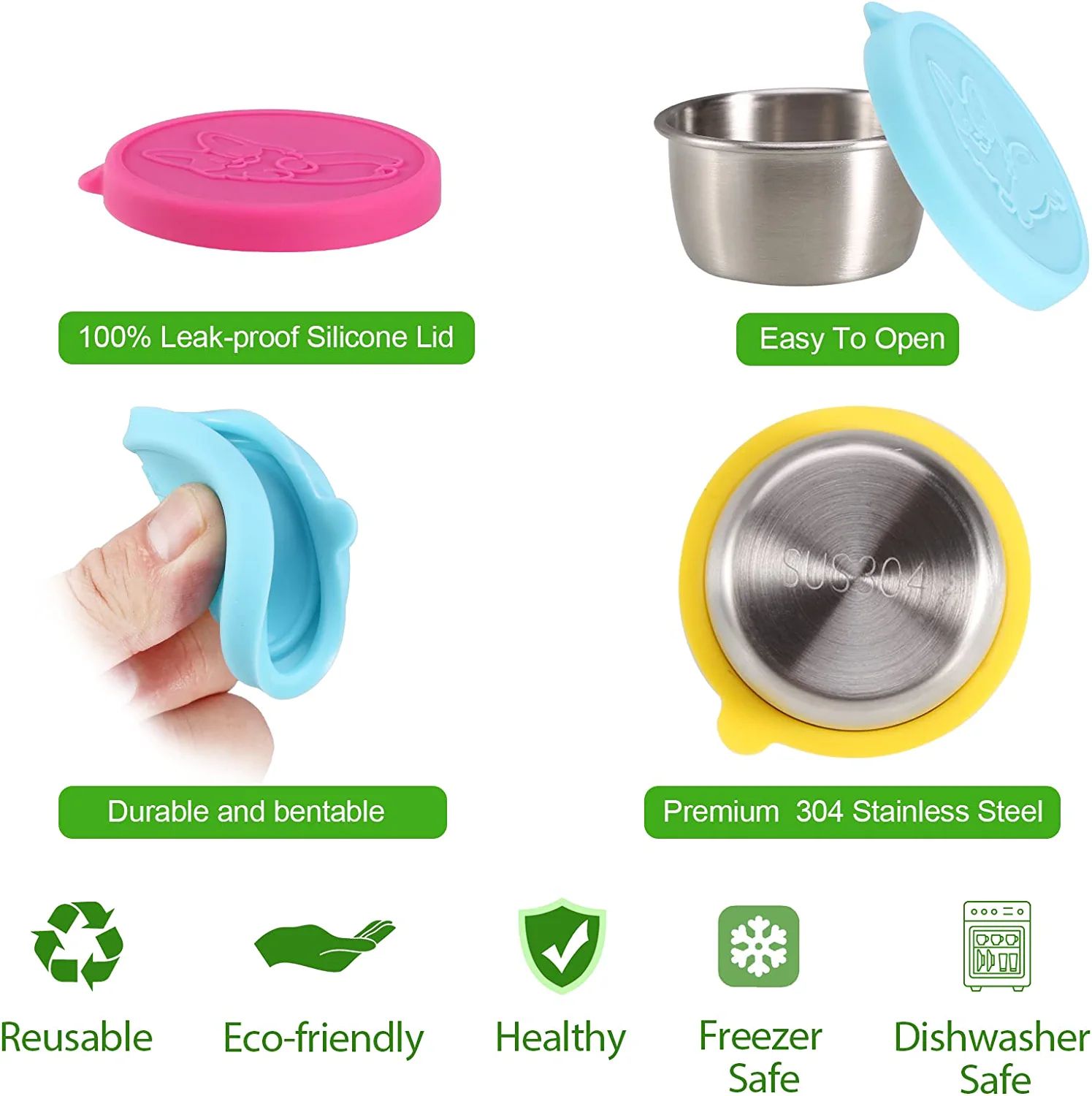 [Safe & Reusable]Made of food-grade silicone and premium 304 stainless steel; our condiment containers are safe for kids and adults. It is dishwasher and freezer safe; easy to clean and reusable; which can replace the disposable plastic containers. Reducing waste and protecting the environment while saving your money.