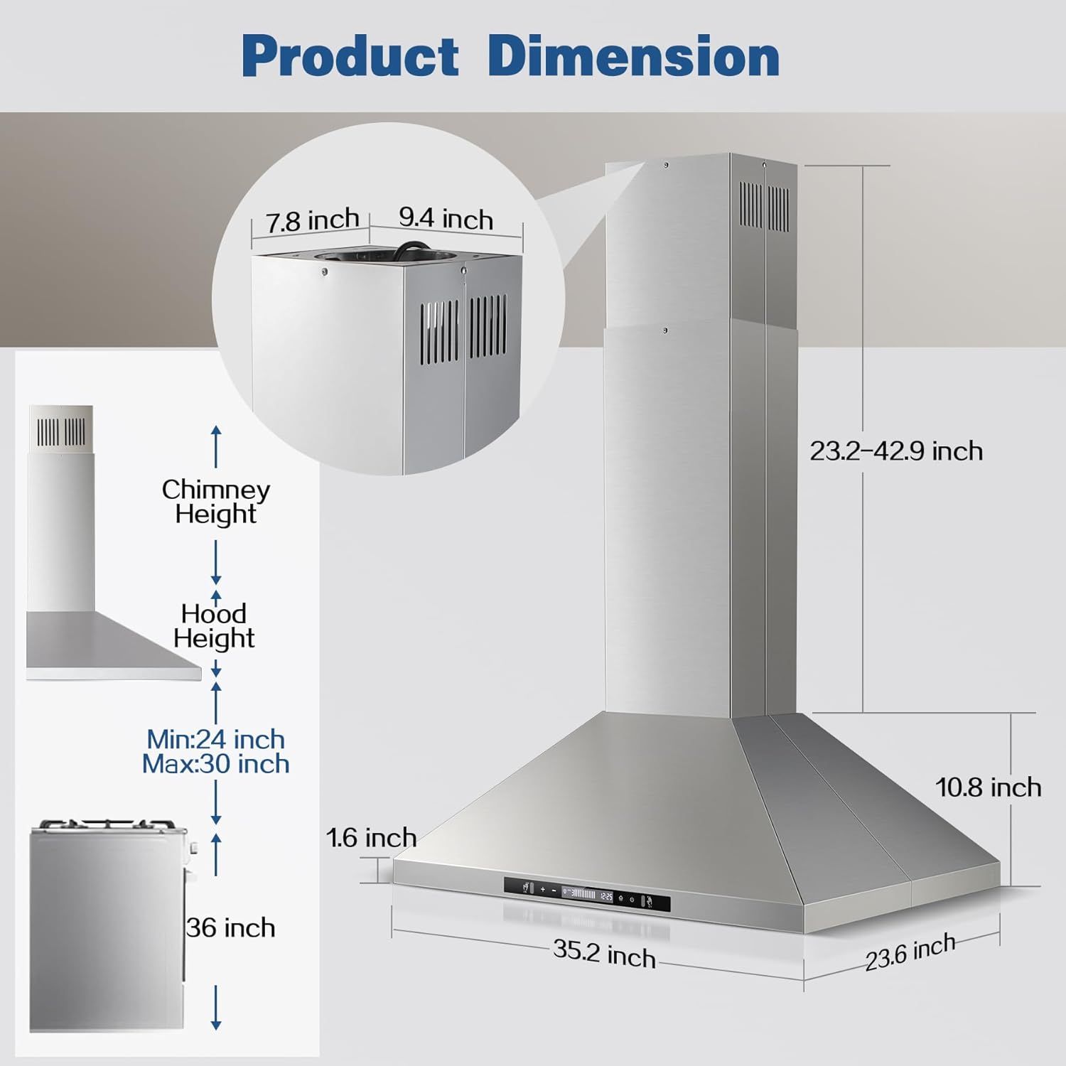 Hassle-Free Installation: With dimensions of 35.2" L x 23.6" W x53.7" H,extendable chimney hood can be adjusted to reach 7.5' - 10' ceiling. This vent hood 36 inch comes complete with everything you need for setup: 2x5-layer aluminum grease filters, a 6.5ft aluminum exhaust pipe, 2x23.6" stainless steel chimneys, and detailed instructions.