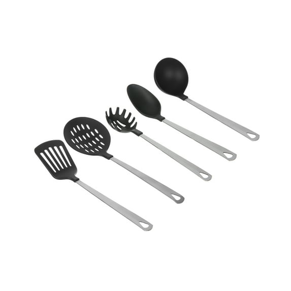Stainless Steel and Nylon 5 Piece Kitchen Tool Set features 1 Solid Spoon, 1 Slotted Turner, 1 Skimmer, 1 Pasta Server, and 1 Ladle. It's a great set to start collecting essential kitchen tools. Use the sturdy loop at the end of the handle to hang these tools up for storage after use. This toolset is made from durable corrosion-resistant stainless steel handles and food-safe BPA-Free and heat-resistant Nylon heads. These essential and practical kitchen tools are specifically designed to fit the palm of the hand ensuring a comfortable experience while at the same time providing quality and value. They store easily in your kitchen drawer, utensil caddy, or hang them for easy access. Makes a great gift! .