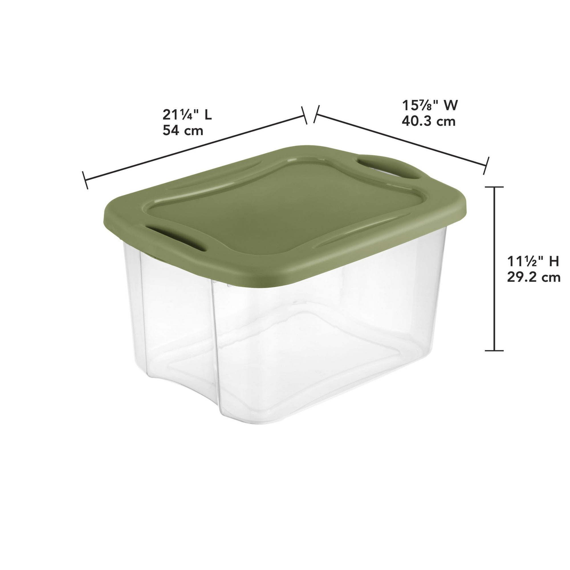 Make moving your storage easier, with 's innovative line of EZ Carry Storage Boxes and Totes! Unique through handles are designed to provide full grip access for comfortable lifting and carrying, as well as easier maneuvering through narrow doorways, hallways, and up and down stairs. The 40 Qt size is ideal for ideal for clothing, accessories, towels, bedding, toys, crafts and more. The clear base allows for quick viewing of contents, and the recessed lids allow same size storage boxes to stack neatly on top of each other to use vertical storage space efficiently. The overall assembled dimensions of this item are 21 1/4" L x 15 7/8" W x 11 1/2" H.