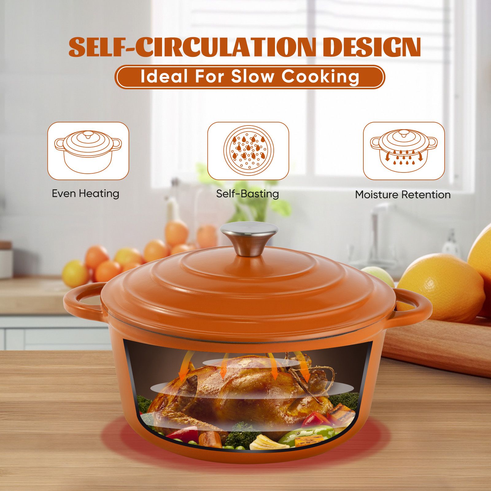 ��ENCLOSED THERMAL CIRCLE: This enameled dutch oven pot is design with circulating shower type lid, the raised design of the pot cover allows water vapor to circulate in the pot and locks the nutrition and moisture of the food, evenly fall on the food to maintain the original nutrition, possess pretty heat retention performance.