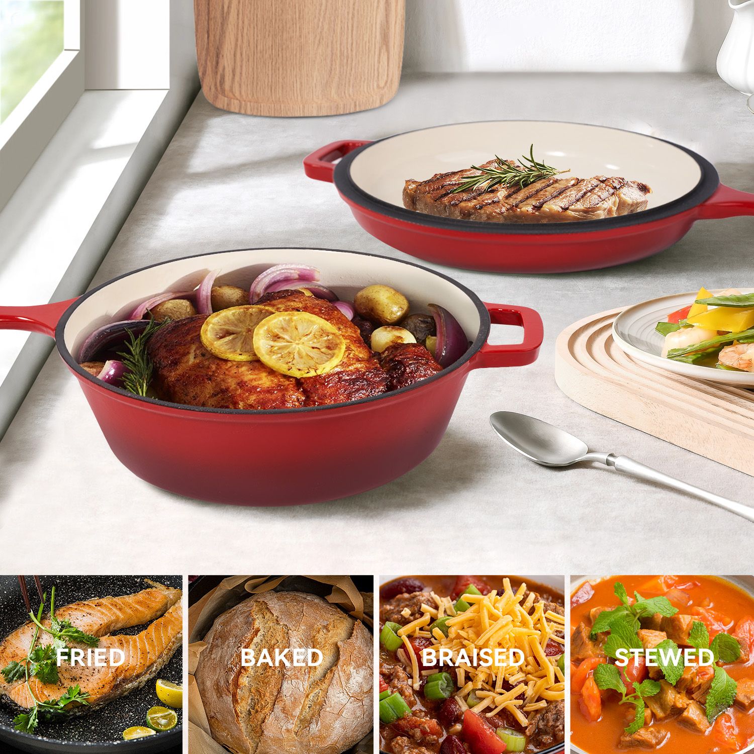 ��ENCLOSED THERMAL CIRCLE: This enamel Dutch oven adopts a circular shower type lid design, with a convex lid design, allowing water vapor to circulate in the pot, locking in the nutrients and moisture of the food, evenly falling on the food, maintaining the original nutrients, and having good thermal insulation performance.
